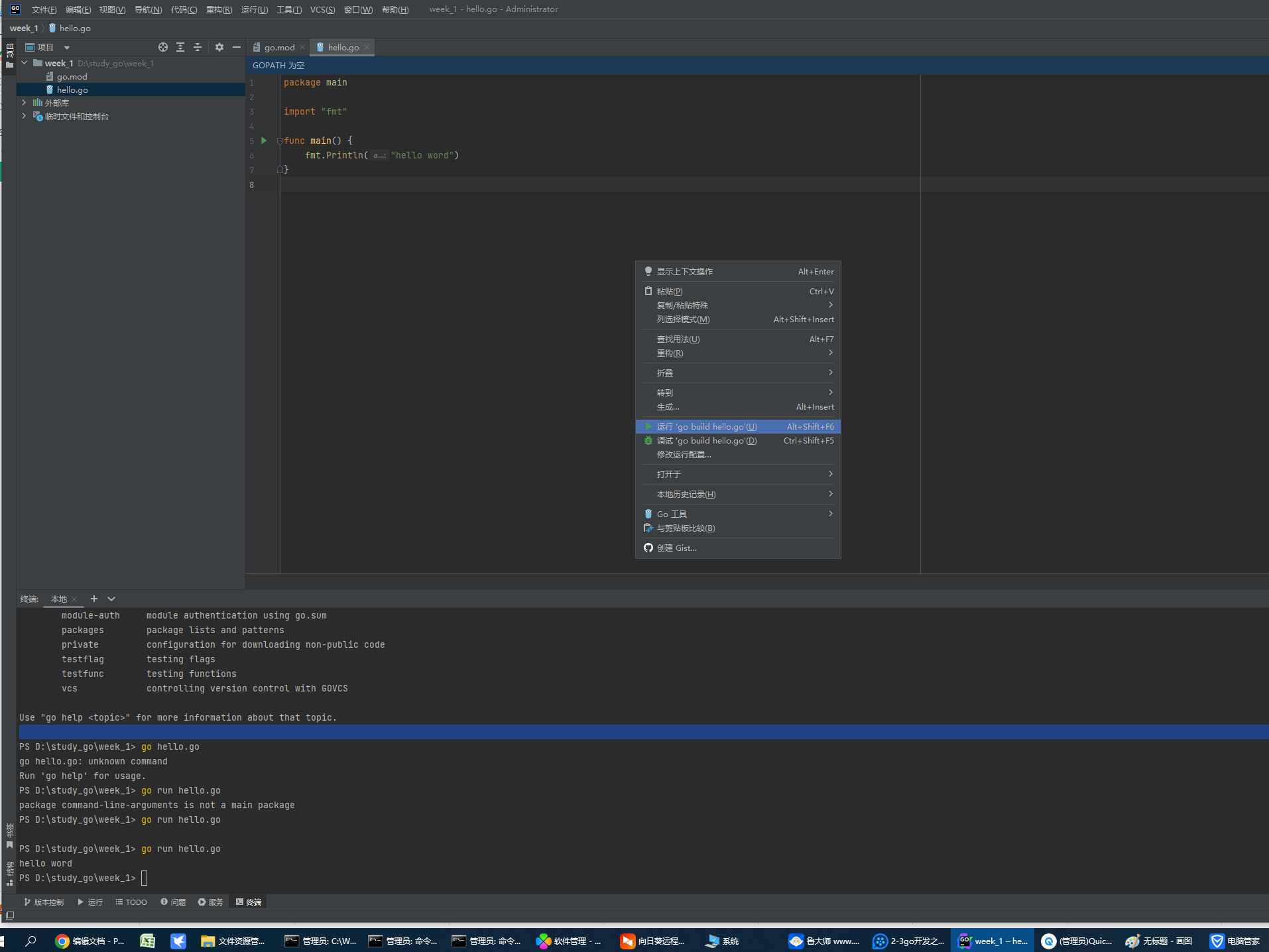 新建项目,然后新建个hello.go文件。它默认package命名会以你新建的项目名称明明,这时候要改成main,不然跑不了